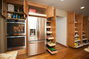 On the opposite wall, separated by a hallway, we dismissed the desk and pantry closet in favor of a double wall oven and expansive, efficient storage. The majority of this new storage has roll out shelves to reach the very back of deep storage. The cabinetry surrounding the refrigerator gives a built in effect for the appliances.